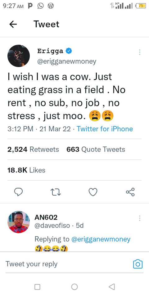 I wish I was a cow. Just eating grass in the field, no sub,no rent,no Job,no stress just moooπππ ………Erigga is one of the fast rising start in Nigeria, a social media influencer and a musician,