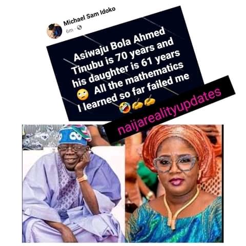 Asiwaju Bola Tinubu @70 while his daughter is 61 Posted byITz Ra sh eedMarch 30, 2022Posted inPolicy Asiwaju Bola Tinubu @70 while his daughter is 61All the mathematic I learned so far failed me..La Lady Alleged Share this: Share on X (Opens in new window) X Share on Facebook (Opens in new window) Facebook Like Loading...